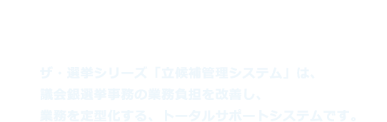 ザ・選挙シリーズ『立候補管理システム』は、議会議員選挙事務の業務負担を軽減し業務を定型化する、トータルサポートシステムです。